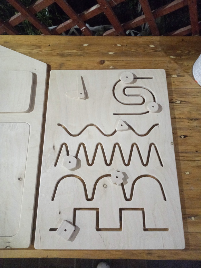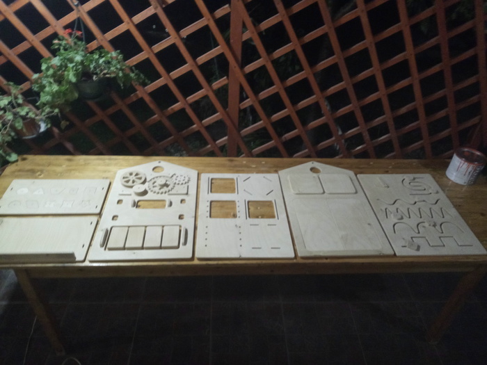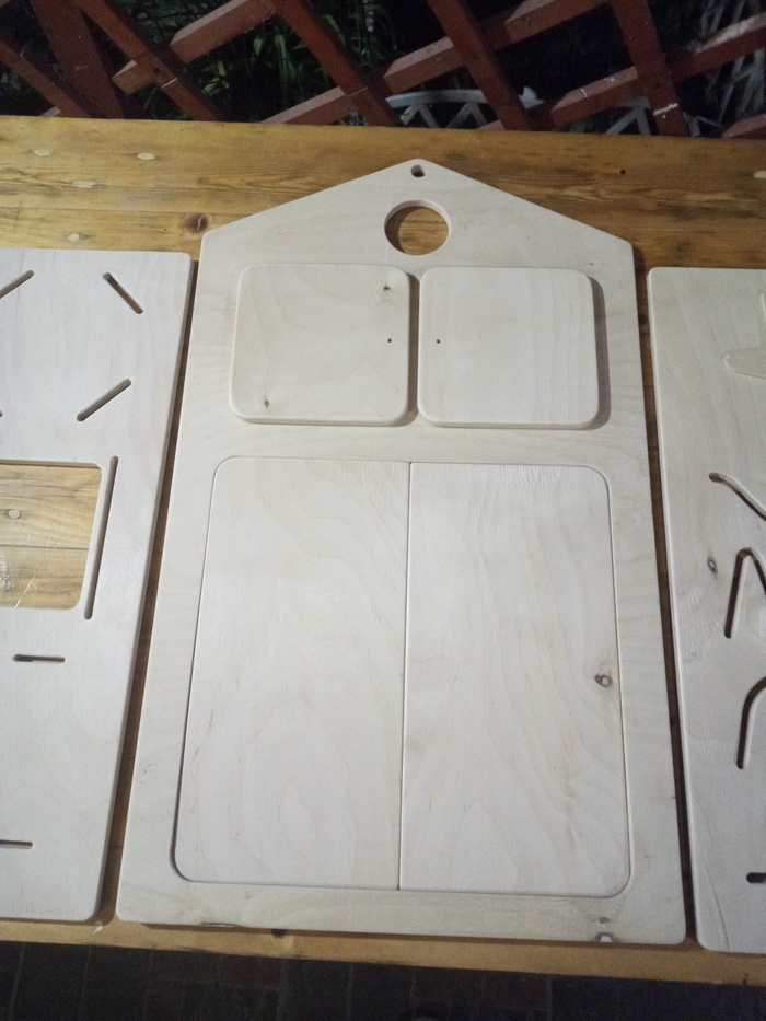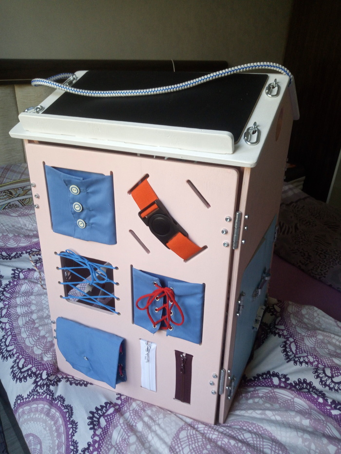 Бабушку попросил сшить кармашки и лоскутки для шнуровки, купил доску для рисования мелками (для крыши), закупился наклейками, для вращающихся плашек внизу, купил верёвки и шнурки.