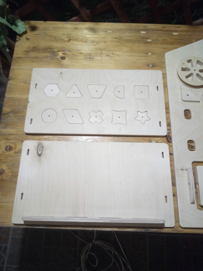 Над дверцами, в оригинале были какие-то непонятное окошки с защёлками. Я подумал, что это уже лишнее, и хотел там сделать какую-нибудь интерактивную штуку с кнопками и звуками (хотел собрать на ардуинке или из готовых китайских модулей для игрушек). Но потом передумал ))) И так подустал я от процесса, да и день рождения ребёнка уже был на носу. В итоге я вырезал лазером из 4мм фанеры надпись - поздравление с первым днём рождения, и она там смотрелась отлично.