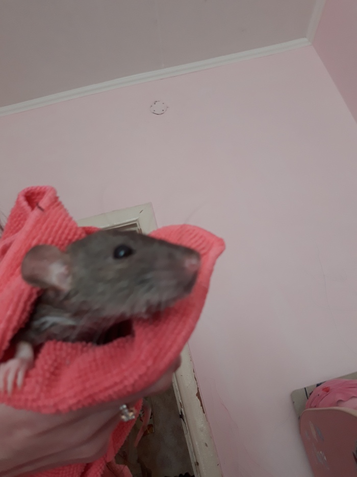 Ровно неделю спустя случилось непредвиденное. Мне в руки попала самочка-подросток (месяца три), маленькая запуганная Печенька, которая никому не была нужна. Я не смогла пройти мимо, и Печенька обрела уютный домик вместо маленького аквариума. Очень пугливая, весь день не ела, сидела в углу клетки. Когда ночью погасили свет, я услышала характерные звуки... Она сожрала всю еду, которую я ей положила сразу по приходу домой. И всю ночь она копала наполнитель, возможно, в поисках еды. Немножко освоилась.