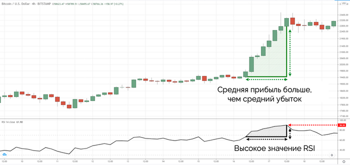 Если RSI выше 50, это означает, что средний прирост больше, чем средний убыток за данный период.