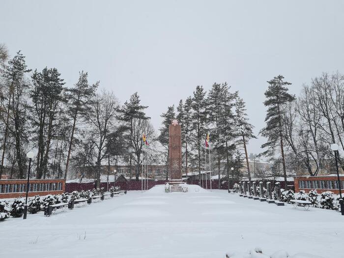 Первая остановка — Мемориал славы воинам-сибирякам. Высокий гранитный шпиль возвышался над заснеженным сквером. Его поверхность отсвечивала прозрачным зимним светом.