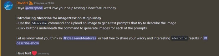 Сегодня разработчики midjourney добавили новую команду, которая позволяет сделать из загруженной картинки 4 варианта описания