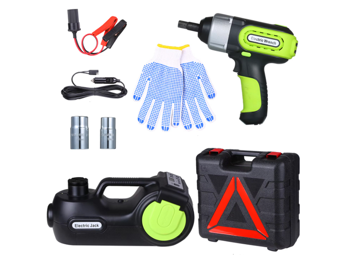 Автомобильный набор, включающий электрогидравлический домкрат, встроенный компрессор и гайковерт. Домкрат поднимает грузы до 1,5 тонны, имеет встроенный фонарик для освещения рабочей зоны. Компрессор оснащен цифровой панелью для удобства использования. В набор также входят клеммы и кабель для подключения.