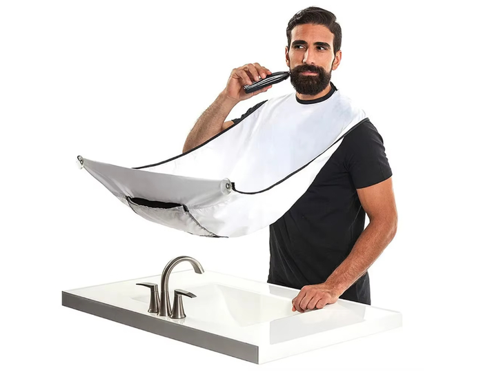 Фартук для бритья с присосками для крепления к зеркалу. Это устройство поможет сохранить чистоту в ванной комнате во время бритья. Легко фиксируется на шее и удерживает все срезанные волосы. После использования его можно просто очистить, вытряхнув содержимое в мусорное ведро.
