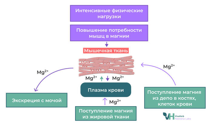 Исследования спортсменов показали, что интенсивные физические нагрузки приводят к снижению уровня магния в плазме крови, а это способствует снижению максимальной силы сокращения мышц, выносливости, времени и максимальной аэробной мощности.
