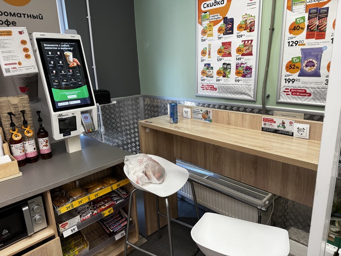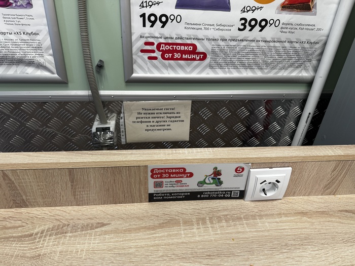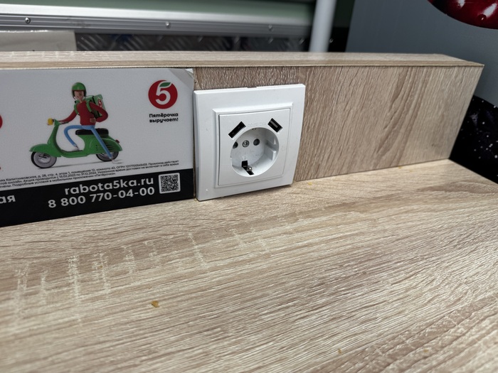 Зашел я третьего дни в «пятерочку» у дома. Вижу, что рядом с островком выпечки поставили барный столик с розетками и стульями. Вроде удобно, но хрена там- розетки не работают. Смотрю внимательнее- и вижу картину маслом. В трех частях.