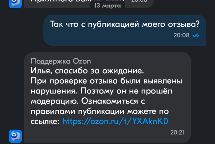 Сам я являюсь давним пользователем Озона мой Ozon ID 36128359 , заказывал много раз с с маркетплейса, в том числе недешевые покупки (цифровые товары, крупную бытовую технику, авиа и жд. билеты), продукты и периодически товары с плашкой "Баллы за отзывы", все покупки оплачивал картой Озон банка. До марта 2025 года никогда не сталкивался с проблемами на данной площадке, однако 13 марта сего года при попытке написания мой отзыв моментально перешёл в статус "Не опубликован", чему я был неприятно удивлён!