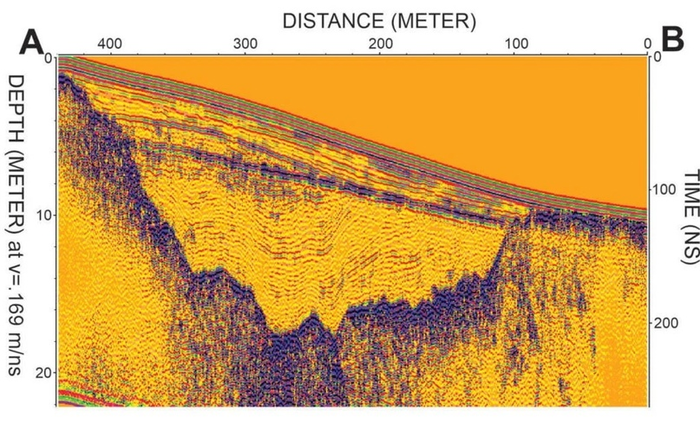 Разброс по размерам, сделанный грунтопроникающим радаром. Фиолетовым цветом отмечены границы осыпи/скалы. Деформированный лёд виден как линии, следующие за рельефом дна