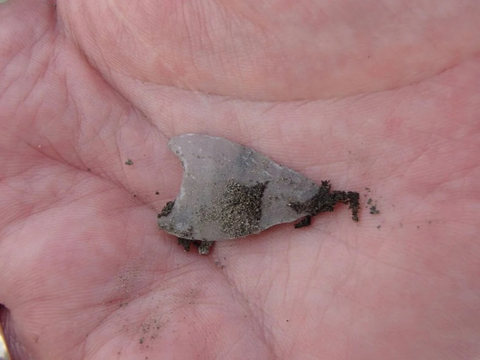 Наконечник стрелы, изготовленный 4000 лет назад из кварцита, через несколько мгновений после того, как он был вытащен из грязи