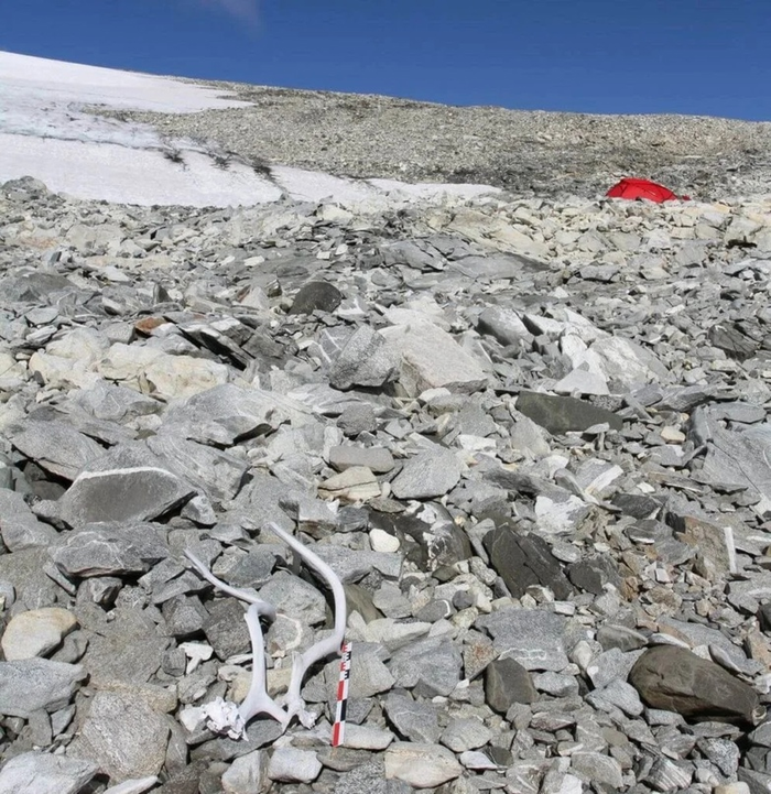 Большой рог северного оленя, лежащий на щебне ниже ледового пятна. Радиоуглеродная датировка: около 1260-1290 года н. э. Это мог быть один из немногих северных оленей, оставшихся после масштабного истребления в поздний железный век и Средневековье
