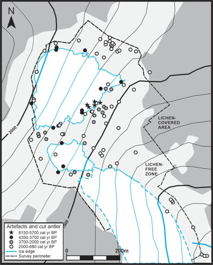 Карта нахождения датированных артефактов и рогов с нарезками. Самые ранние находки — ближе к нынешнему расположению льда, более свежие — дальше