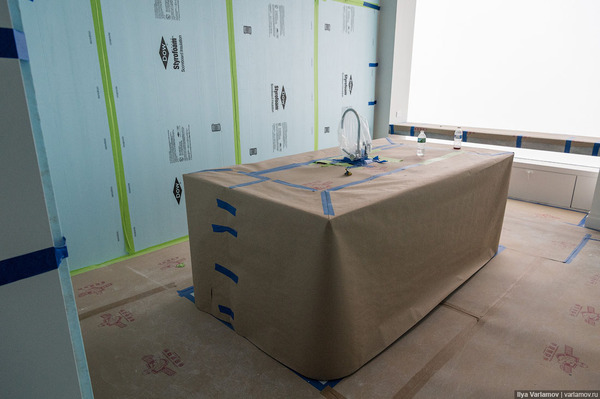 Кухня уже готова, но закрыта защитными панелями.