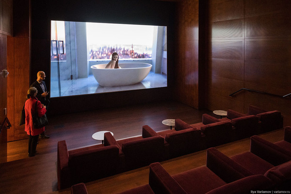 На 2-м этаже есть кинотеатр для жильцов. В нём крутят кино про дом, где показывают, как будет смотреться голая женщина в неудобной ванной ) Смотрится неплохо!