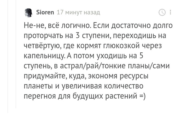 Знаете, говорят, мол, если сыроедишь, а затем попробуешь варёную пищу, то будут проблемы в виде соплей, головных болей, простуды и прочих якобы симптомов "детоксикации". Так вот, на третьем месяце сыроедения я съел тарелку варёной моркови. У меня не было никаких проблем абсолютно. То есть, понимаете, сыроеды много чего говорят, но из этого много чего не работает. В среде сыроедов часто есть какая-то информация, которую попросту кто-то придумал. Например, кем ты станешь и что ты приобретёшь после "переходного периода". Ведь этих 80-90% эти плюсов просто нет. Да, здоровье, может быть, всё же поправляется (я не заметил ничего особого на себе, разве что болеть голова перестала, но это потому, что перестал употреблять соль), но не больше. Может быть и сама теория сыроедения является выдумкой?