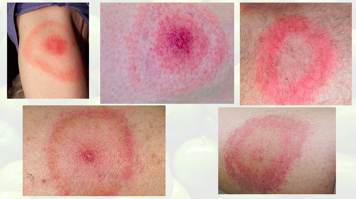 В целом начало заболевания очень схоже с энцефалитом, но в случае боррелиоза есть четкий отличительный признак – изменение на коже. На месте укуса образуется ярко-красное пятно, которое окружено красным кольцом (т.н. кольцевидная эритема).
