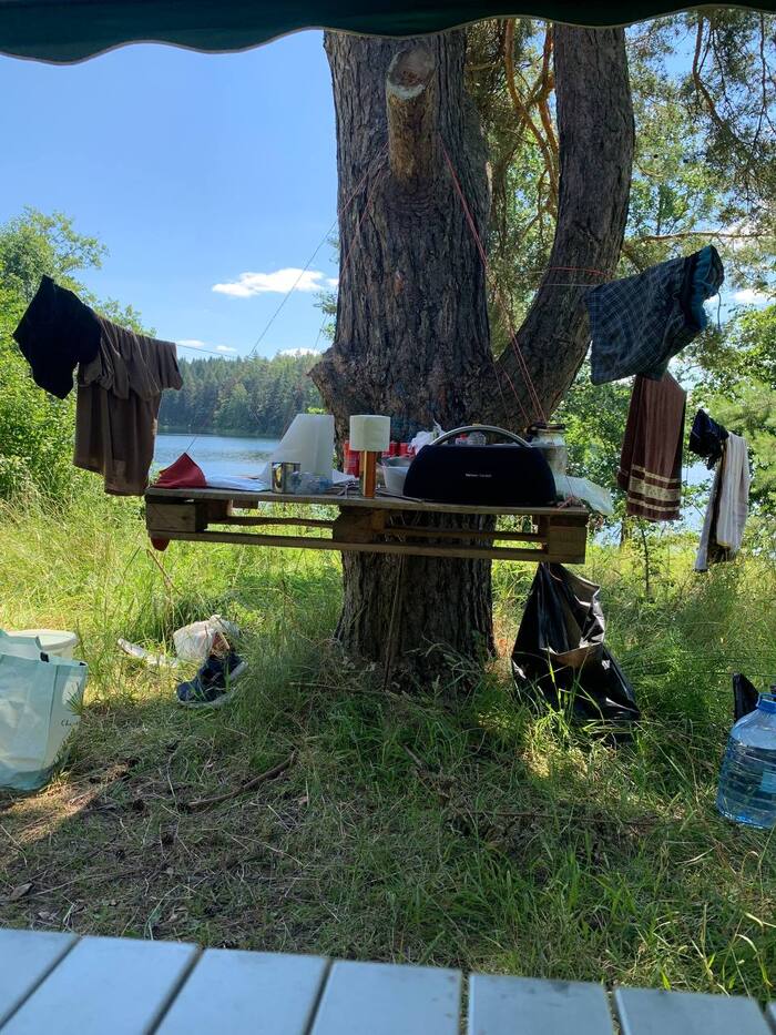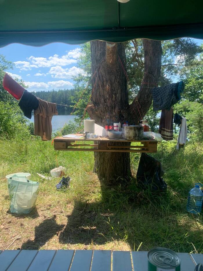 Вот только вернулись с отдыха на природе. Во время отдыха возникла необходимость в хозстоле, моя соображалка изобрела вот это. Сразу скажу стол не болтался из стороны в сторону, потому что был зафиксирован не только сверху, но и с боков. Откуда в том месте постоянно берутся поддоны я вообще хз))))