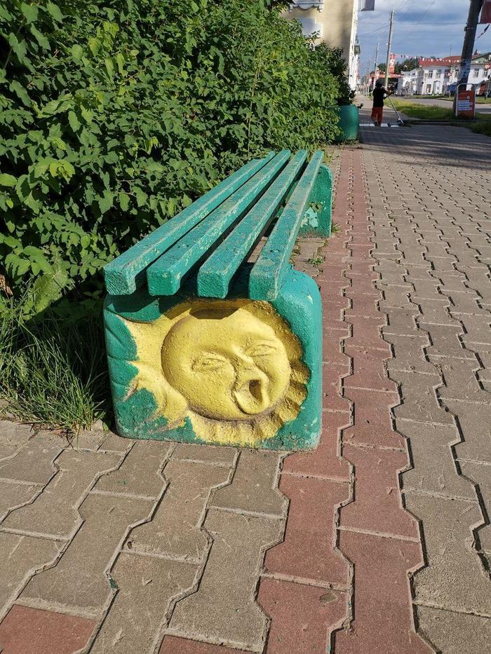 И тут безумный скульптор орудовал над городскими скамейками. Что тут делает солнышко? А если это не солнышко, если это, например, колобку больно в печи? 😱