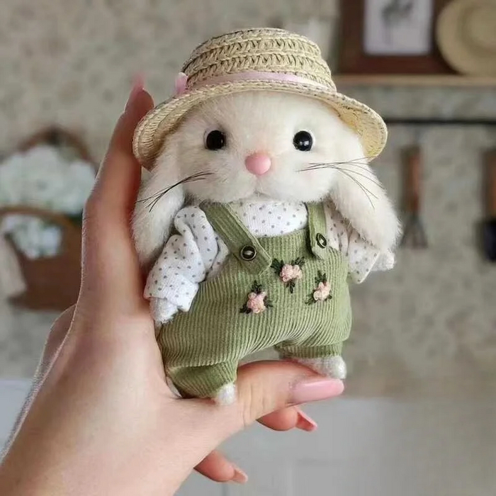Кролик одет в стильный комбинезон и шляпу, что делает его идеальным для установки у садовой дорожки или вблизи цветущих растений.
