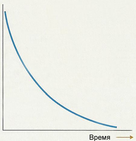 По оси абсцисс – годы рождения изобретений, по оси ординат – сроки их реализации. И разброс точек весьма кучно расположился вдоль некоторой средней линии, напоминающей спадающую экспоненту.