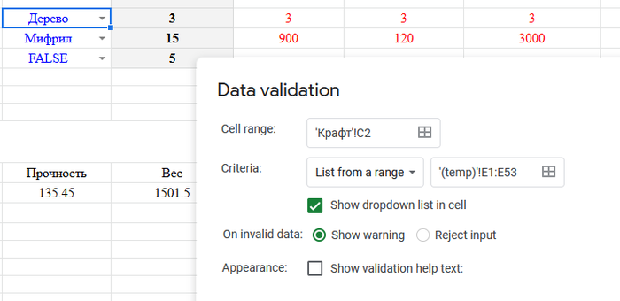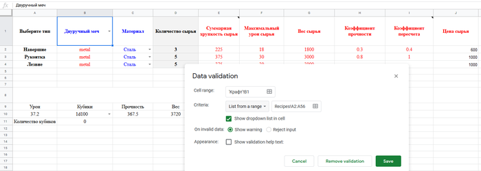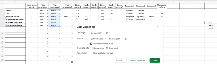 C) Необходимо для каждого рецепта выбирать свои материалы. Поэтому ставим "Data validation" по тому листу, который мы сделали чуть выше, с 3 столбцами с названиями материалов. Так как лист динамически обновляется, то выбор для каждого рецепта по материалам будет свой.