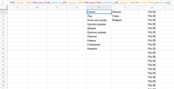 Тут в трёх столбцах проводятся проверки, какой тип материала используется в крафте, и выводится таблица с названиями из нужной таблицы.