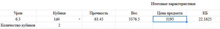 Для расчёта кубиков используется дополнительная ячейка с формулой =if(B10="1d4",4, if(B10="1d6",6, if(B10="1d8",8, if(B10="1d10",10, if(B10="1d12",12, if(B10="1d20",20, if(B10="1d100",100,0))))))), в которой заменяем "человеческий вид" кубика (1d4 в данном случае) на численный. Урон подсчитывается сложением построчных умножений "урона материала" на "коэффициент пересчёта". Аналогично для прочности и остального.