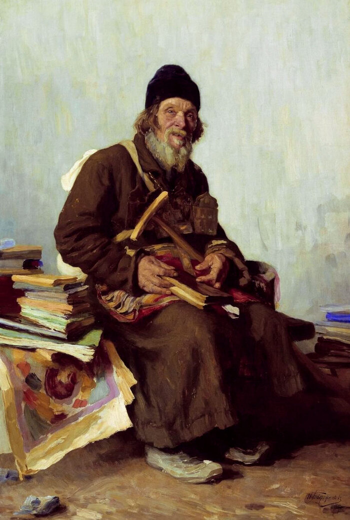 А это бродячий торговец книгами – офеня. Услуги офень были особенно востребованы в деревнях и районах, где не было своих книжных лавок. Офени предлагали книги, брошюры, лубочные картинки и иную печатную продукцию. По воспоминаниям современников, среди крестьян особой популярностью пользовалась религиозная литература, жития святых, разные жуткие истории, а также сказки и то, что сейчас назвали бы фэнтези.