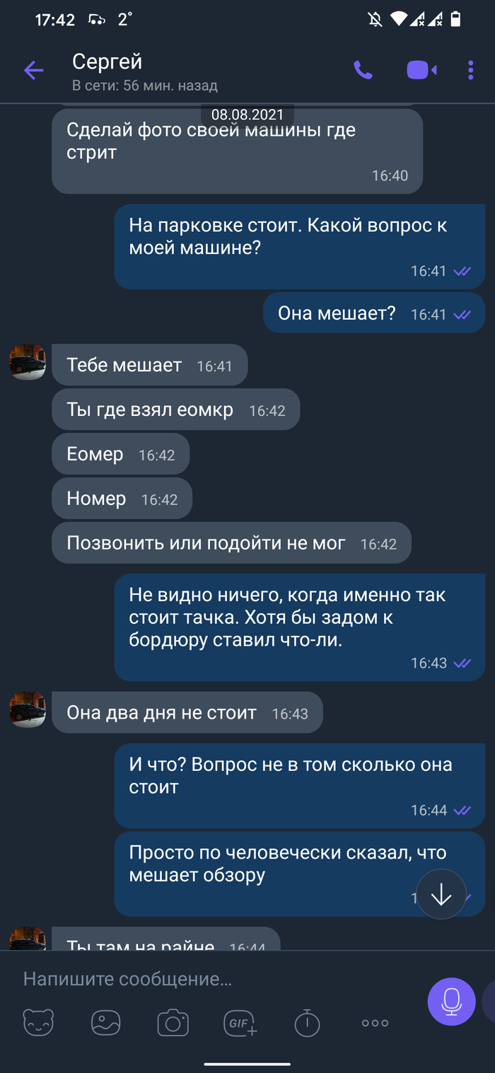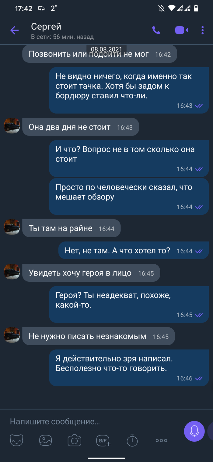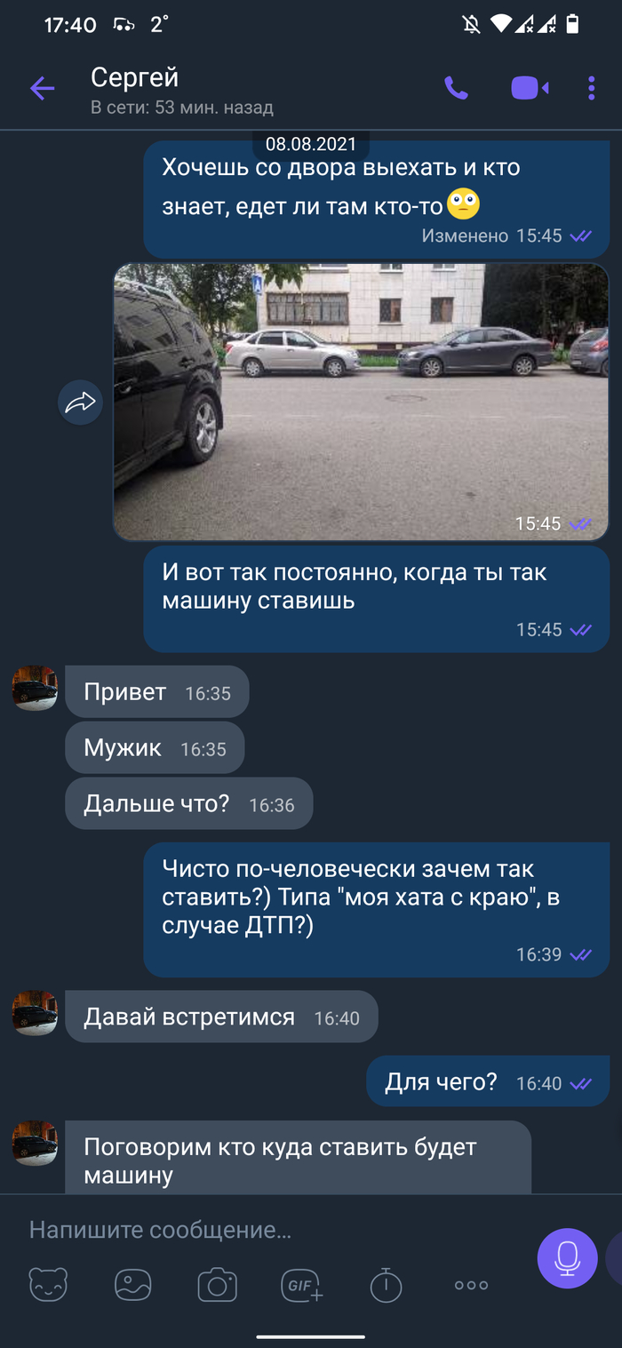 Негативное общение в Viber, но больше, кстати, он так не встаёт. Если появляется на том же месте, то жопой к бордюру. И хоть что-то стало видно при выезде со двора.