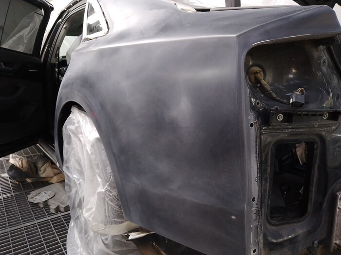 Далее жестянщик готовит деталь под шпатлёвку, и, собственно шпатлюет. Наиболее "глубокие" места "волосянкой" (шпатлёвка с наполнением стекловолокном). Далее - "софт" - для совсем небольших неровностей. Шлифуется всё абразивами Р80-Р120 (тут и далее - речь только о сухой шлифовке, никакой воды) и в таком виде уже приходит в малярку.
