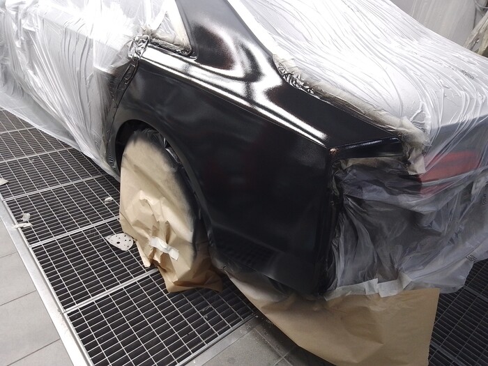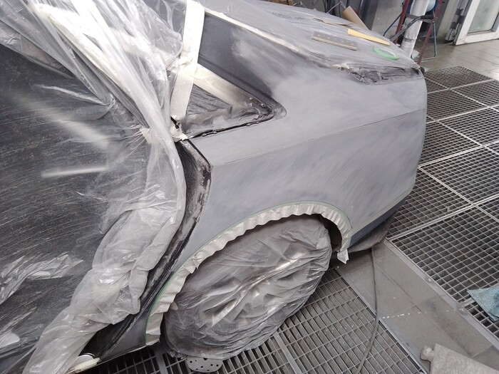 На фото ниже как раз он в процессе нанесения, еще сырой. Наносится в 2-5 слоя с промежуточной выдержкой между слоями 5-10 минут. Сушка - либо ИК-лампа, либо окрасочно-сушильная камера (ОСК), либо просто оставить на ночь при обычной температуре.