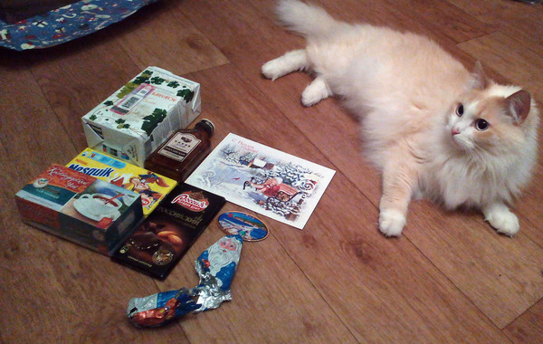 Встречает посылочка доброй новогодней открыточкой с приятными пожеланиями. А замученный новогодними праздниками котэ все же соизволил произвести контроль качества, ну как же без него то.