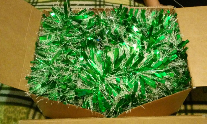 Вскрываем коробку и нас встречает очень мягкая мишура изумрудного цвета. Красота: