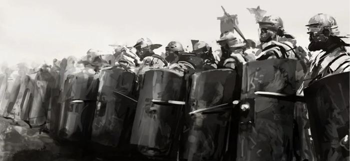 ...Когда навстречу потоку встал строй щитов, я подхватил с земли камень и швырнул изо всех сил. Эх, отскочил! "Молодец, пацан!", ухмыльнулся кто-то, вслед за мной нагибаясь за камнем. Булыжники застучали по щитам -- легионеры выстроились "черепахой" (разболтанной и не слишком умелой, как понимаю я с высоты тридцати лет службы), но вреда каменный дождь нанес немного. Вскрикнул неудачливый легионер, центурион проорал команду: что-то вроде "держать равнение, обезьяны!", строй щитов дрогнул и медленно двинулся на нас.