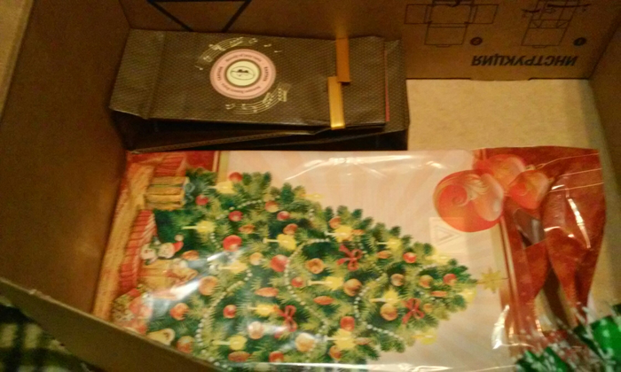 Увесистый пакет пока достаём и аккуратно откладываем напоследок. Под ним оказывается ещё один новогодний пакет и чай: