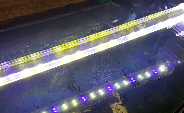 Жил был аквариум в 250 литров. Освещался лампами дневного света. Но из-за попадания влаги, лампы выходили из строя раз в год. Купил на алиэкспресс герметичную светодиодную лампу. И решил весь аквариум почистить с перестановкой гротов и коряг. Сменил воду. Отдраил все от небольшого количества зеленого налета на стекле и фоне. Поставил новую лампу.