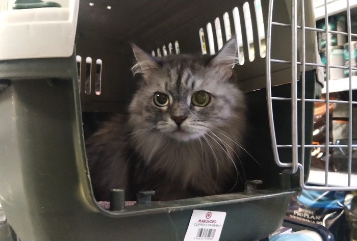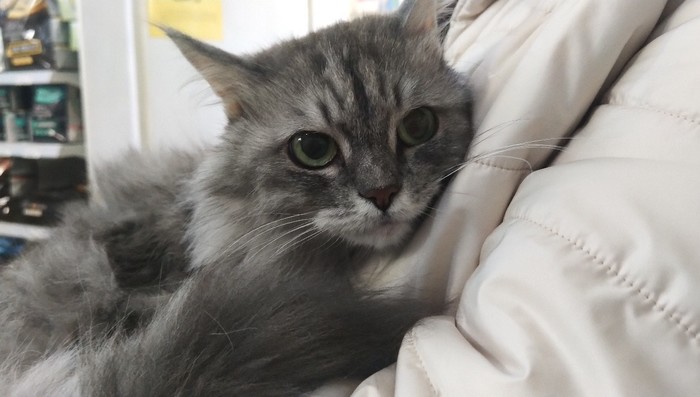 1,5 месяца назад к нам в подъезд подкинули (?) эту шикарную, серую кошку. Расклеивание объявлений и размещение постов в пабликах города, результатов не дали. В данный момент кошка живёт на передержке в вет.клинике. Мы её стерилизовали, обработали от блох и глистов, и привили.