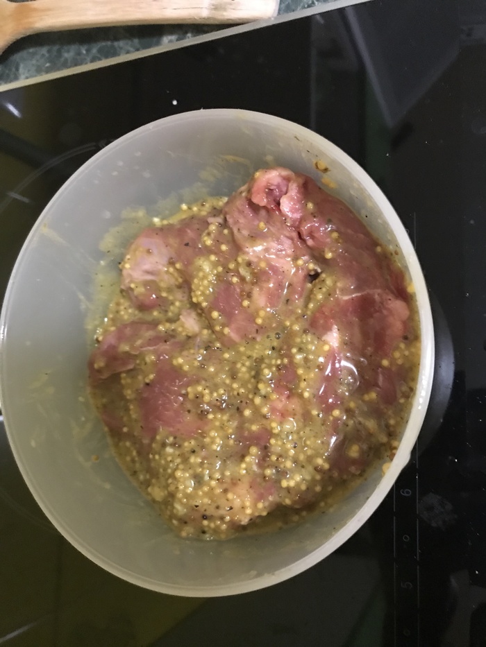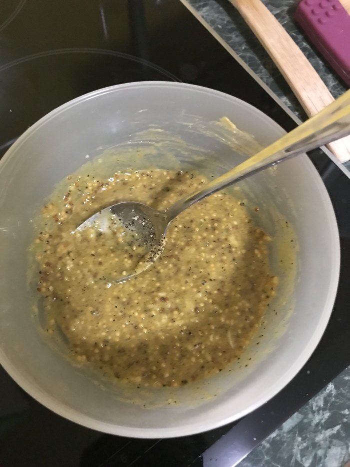 Замешиваем наш маринад, вываливаем все в один тазик и перемешиваем. То есть соль, давленный чеснок, обе горчицы, мед, хмели-сунели и перец. Получается вот такое: