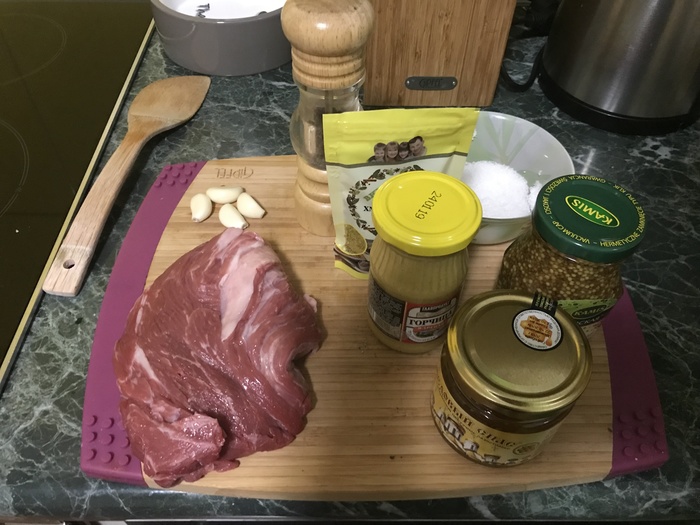 Выглядит конечно страшненько, дальше еще страшней будет. Духовка разогрелась и тут у нас хитрый квест, фигачим туда мясо на 1 час 30 минут, но! через 15 минут от начала запекания снижаем температуру до 200, еще через 30 минут до 160.