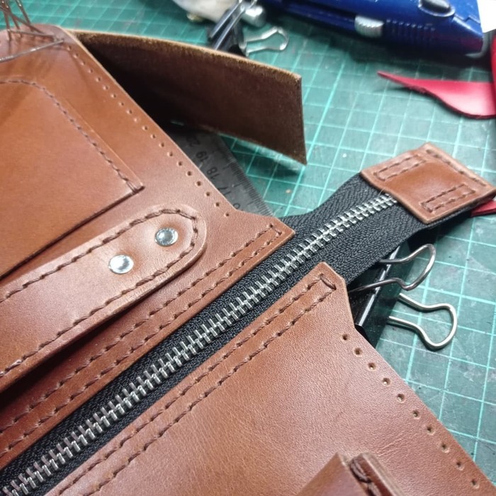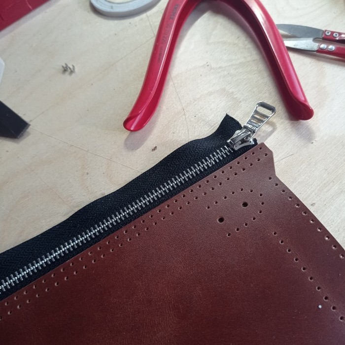 Урезы в тех местах, что будут недоступны после сборки обработаны. Использована рулонная молния №5, отдельно поставлены бегунки и стопоры. Фиксирую перед прошивкой двухсторонним скотчем.
