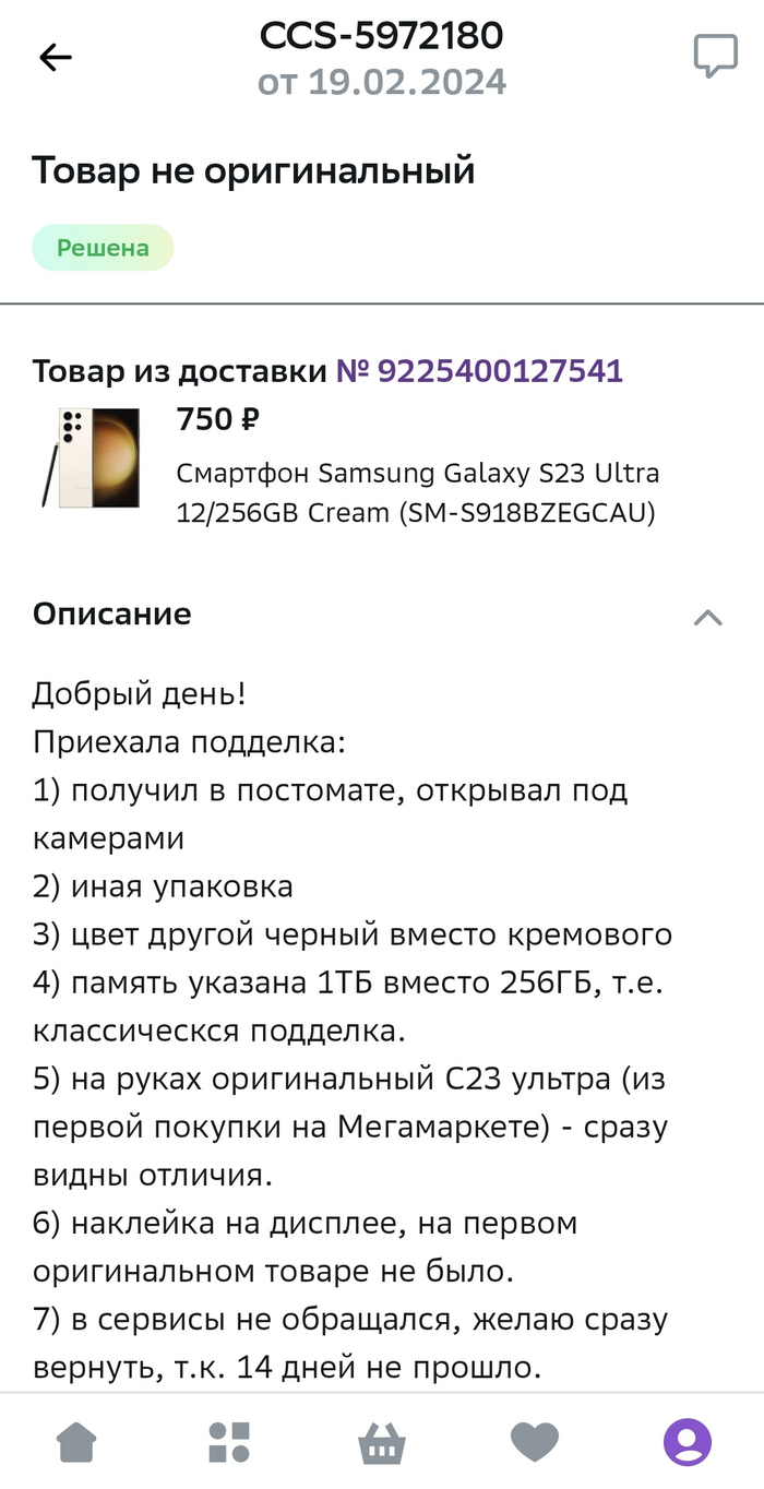 Наконец-то все прогрузилось, обращение (Товар не оригинальный) направлено, требование - возврат, приложены фото, естественно (кто бы мог подумать?) никто в этот вечер ничего не одобрил и ушел я домой с подделкой.