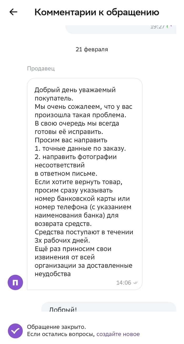 21 февраля приходит ответ от продавца, что он сожалеет, просит рассказать еще раз, что не так (ну супер же все??), предоставить реквизиты для возврата средств и т.д.