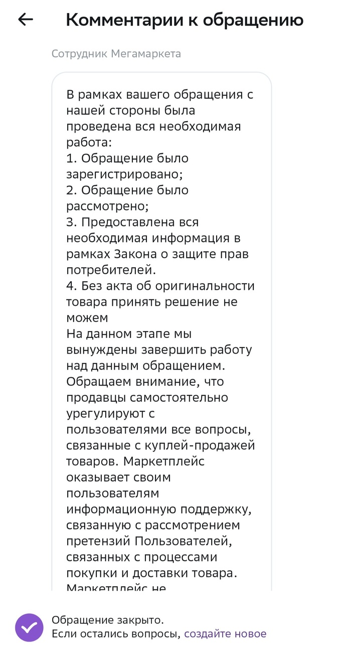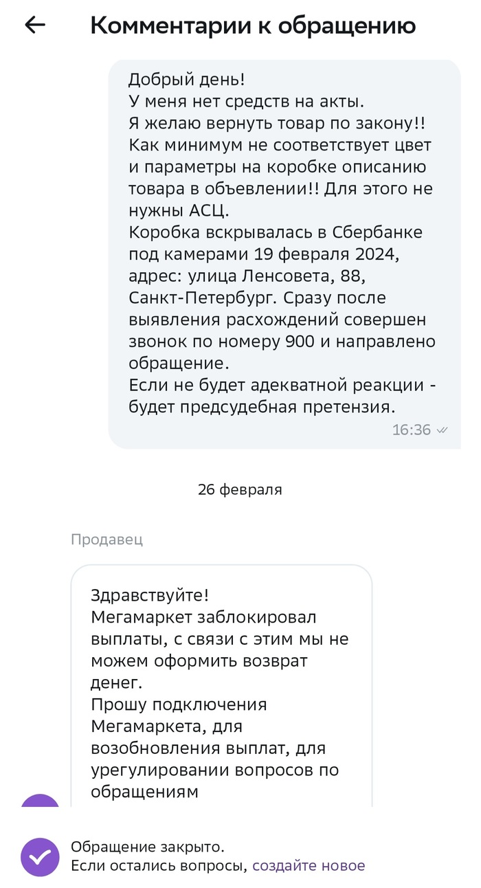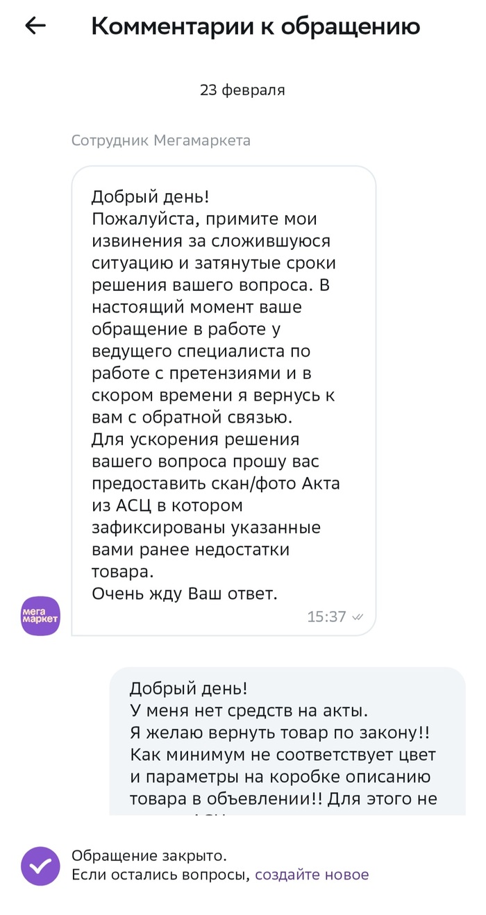 1 марта приходит сообщение... что "мы долго думали и решили вас послать лесом, раз у вас нет Акта из АСЦ, вот вам продавец, разбирайтесь сами, обращение закрываем".