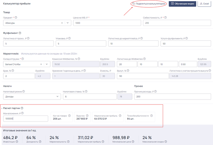 Это бесплатный калькулятор для подсчета маржи товара. Зачем он если есть эксель? Он знает все тарифы ВБ выбираешь категорию склада размеры и вуаля он считает выручку маржу и точку безубыточности. Главный плюс можно скопировать ссылку с расчетами и отправить кому угодно Ссылка marketguru.io