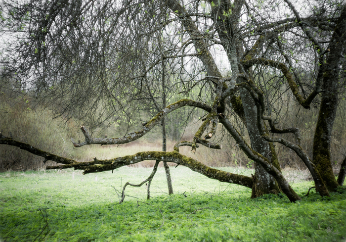 в общем, не было там никакого дерева. пенёк был старый, никто его и не замечал. так этот художник сраный просто спилил слой для своих творений.