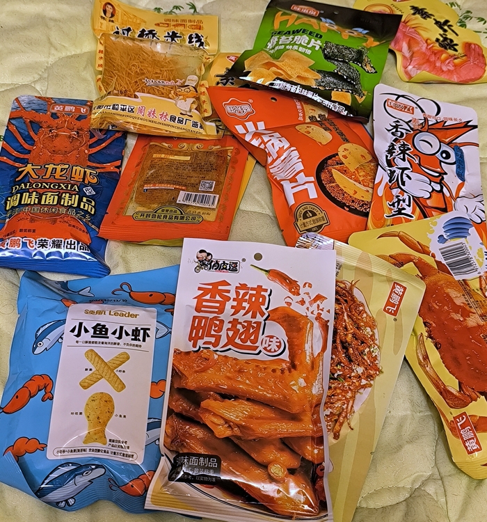 А вот такое я указываю и отправители безошибочно кладут всегда. Куча азиатских закусок, большая часть не совсем понятно из чего сделана, но калейдоскоп вкусов обеспечен. В этот раз в меру острое, идеально.