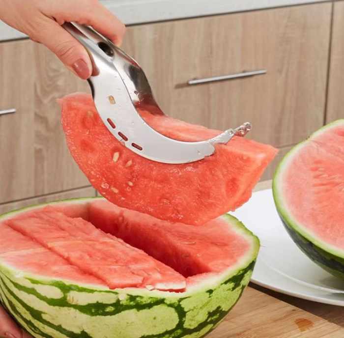 Удобный инструмент позволяет быстро и аккуратно нарезать арбуз на равные кусочки. Лезвия из нержавеющей стали легко справляются с плотной мякотью, не деформируясь со временем. Эргономичная ручка обеспечивает надёжный хват. Слайсер упростит сервировку и сделает процесс нарезки арбуза приятным и безопасным.
