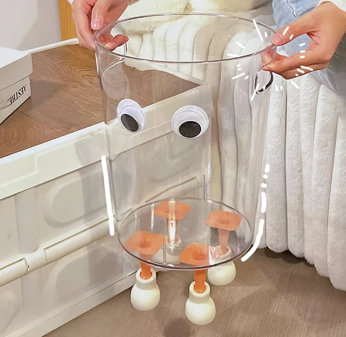 Мусорный бак сочетает в себе практичность и декоративную привлекательность. Прозрачные стенки позволяют легко следить за наполненностью, а мультяшный стиль делает его идеальным для спальни, детской или гостиной. Компактные размеры и лёгкий вес упрощают перемещение. Такой аксессуар не только удобен, но и поднимает настроение своей необычной внешностью.