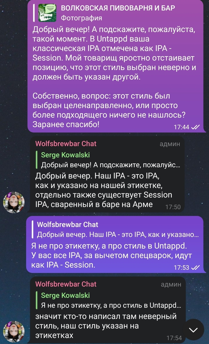 Я бы не задался одним интересным вопросом, если бы не товарищ @kviten. У нас вышел спор по поводу правильного указания стиля и сорта этого эля в соцсети Untappd. Там он значился как "IPA — Session". Я склонялся к мысли, что пивоварне виднее, а оппонент отстаивал точку зрения, что кто-то косякнул, когда заполнял карточку пива. Для разрешения вопроса пришлось обратиться непосредственно к представителю "Волковской".