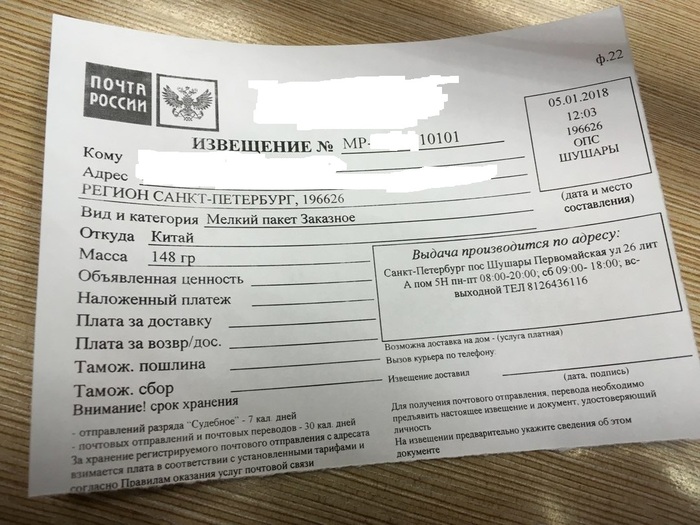 Придя на почту и написав трек номер посылки, сотрудник почты распечатал бланк извещения и попросил на пустой обратной стороне написать паспортные данные.