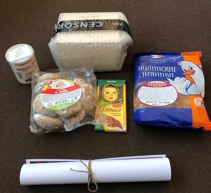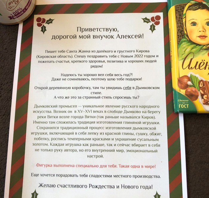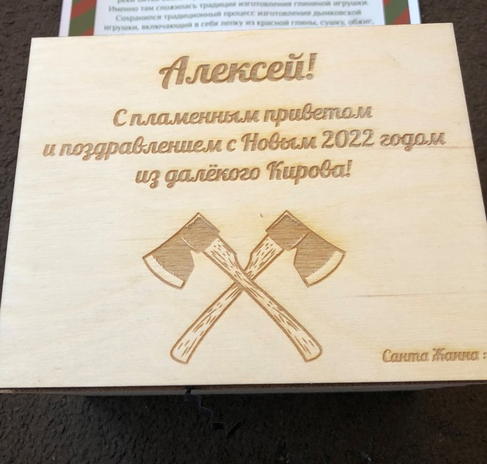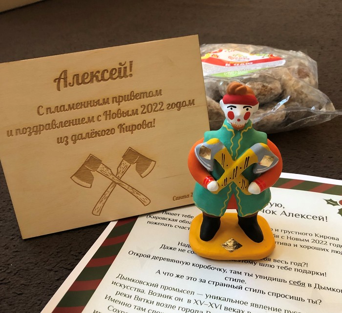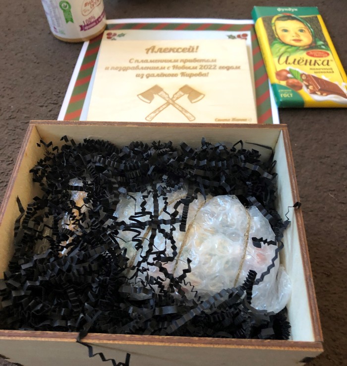 Долгое ожидание пока подарок долетит до острова того стоило в сто крат. Такс, без всяких долгих предисловий, открываем подарок. Первое что увидел это ПРЯНИКИ, настоящие, русские ПРЯНИКИ. Ставим подарок на паузу, делаем чай, открываем пряники. Ляпота. Вернулись к подарку с разогретым апетитом, а что тут ещё вкусненького!? Так, кексики, трушное арахтсовое масло, АЛЁНКА! Как бы ни хотелось слопать Алёнку вот прям сразу, скрипя зубами, ложим её в полку к вискрю. Будем делиться Алёнкой с друзьями. Вернемся к подарку. Хм свиток, заинтересовали! Прочев свиток, выучил новое заклинание на душе стало так тепло и задрожали руки от эмоций предвкушения. Аккуратно распаковываем коробочку, естественно не забыв перевернуть её вверхтормашками, поворвчиваем ее правильной стороной вверх. Оформление верхней крыжечки шоворит о том что Супер секретный Санта сделала хорошее расследование по социальным сетям, на ней отсылка к моей любимой работе. Внутри коробочки чтото продолговатое, твердое и замотанное в пупырошковую упаковку. Аккуратно разматываем, письмо явно намекает на керамику внутри, а она может быть хрупкой, да? И видим милого розовощекого богатыря со скрещенными топорами. Звуки умиления от большого дядьки.